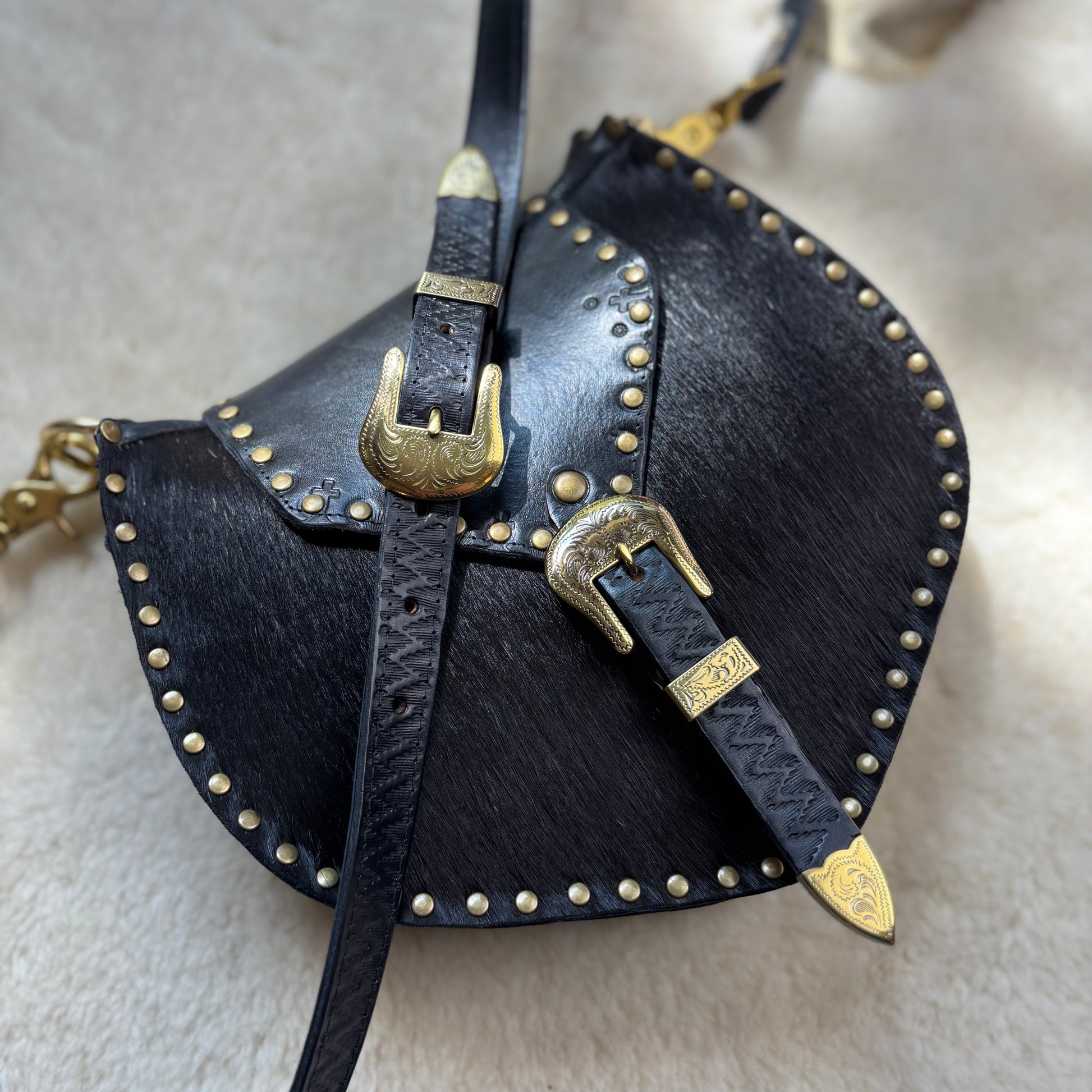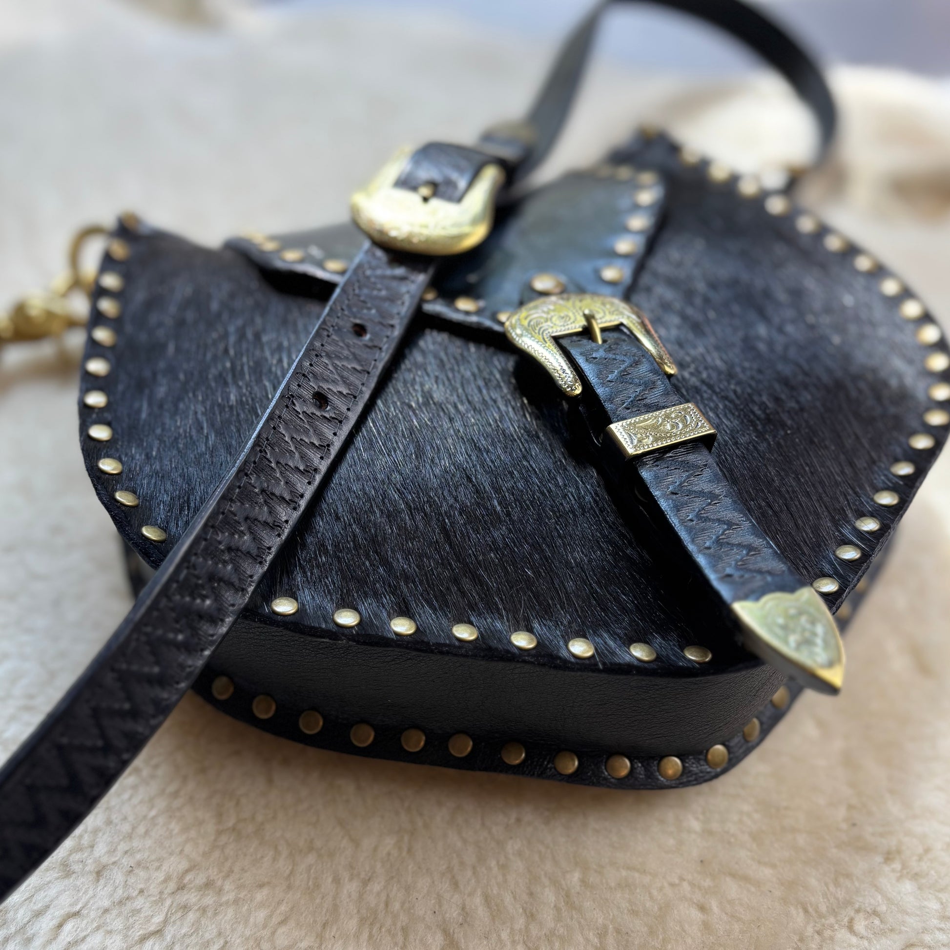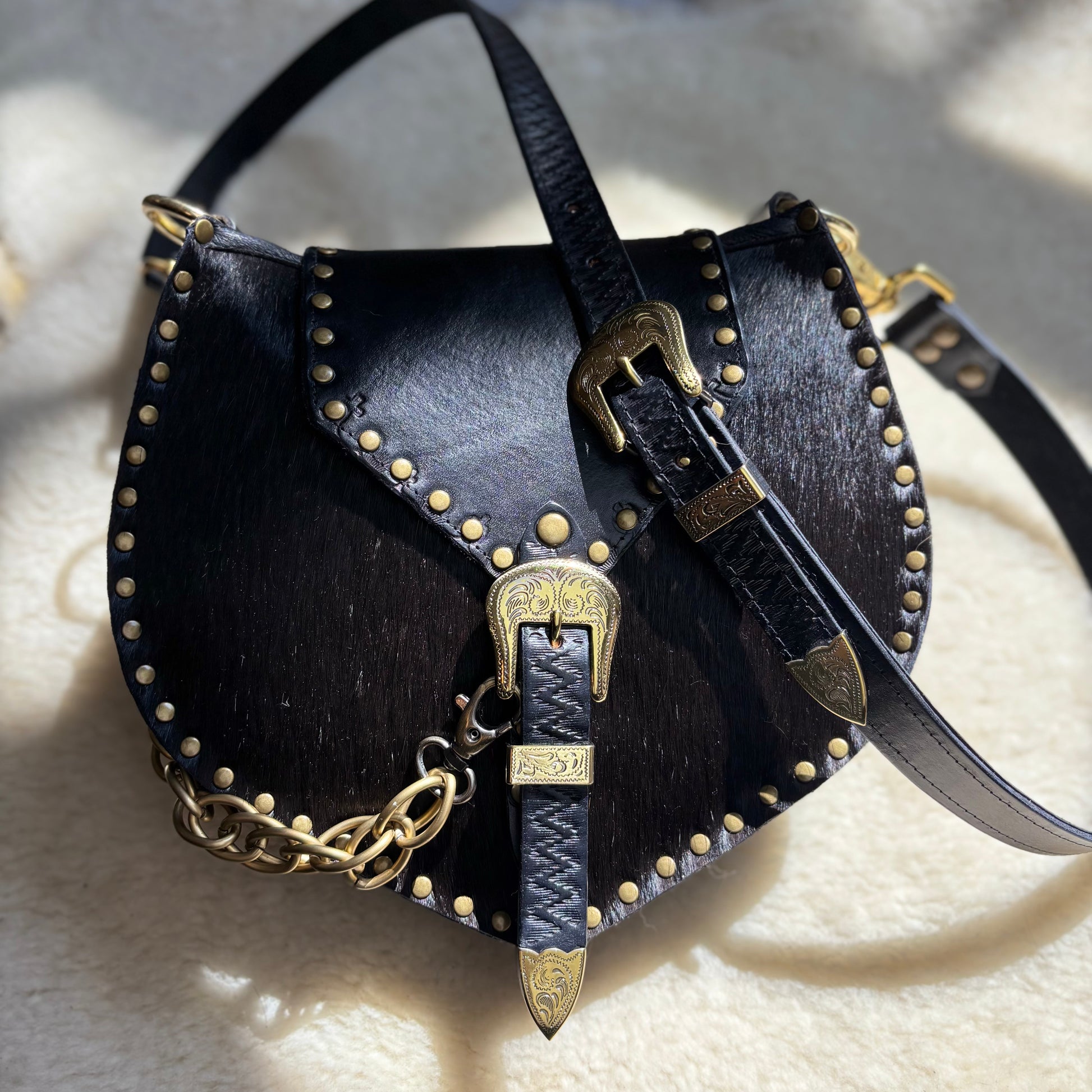 Made out of black hair-on cowhide, mixed with leather sides and back, along with hand stamped straps and accents and beautiful gold engraved buckles. The gold chain has clasps on each end and you can easily change the configuration of the bag. Remove the long strap and add the chain for a hand held handbag, or use the chain as an accent when worn crossbody.