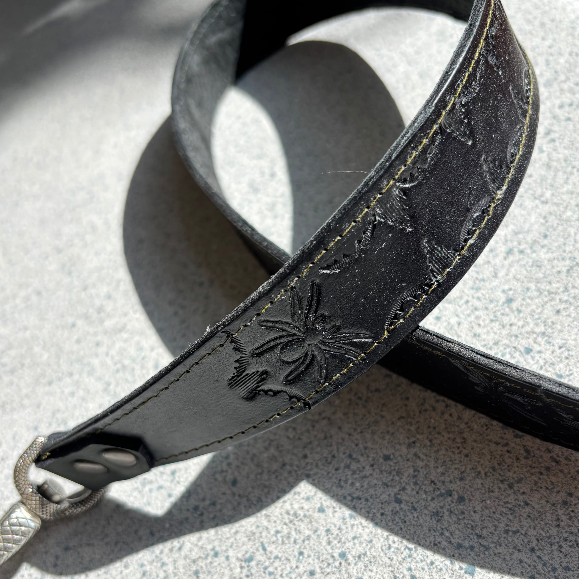 Made out of primarily reclaimed leather- salvaged, laundered and refreshed! I then added an underlining for strength & support before stitching the cobwebs on. That was so much fun!!! I added a couple of reclaimed pieces, including the top flap and the back phone flap. The strap is stamped with spiders and fangs, underlined in suede and attached to the bag with the coolest python clasps! I added some rings stacked down the sides, not just because I thought it looked cool, but also with the idea that you’d hang stuff on it (hint: bag charms 😉) or reconfigure the rosary chain that is included with this bag. The chain is made with an actual rosary, along with various reclaimed chains & charms. The bat has its own hook and can be attached pretty much anywhere. Stays closed with a strong magnetic snap. Fully lined with actual casket lining fabric and has 2 interior pockets.