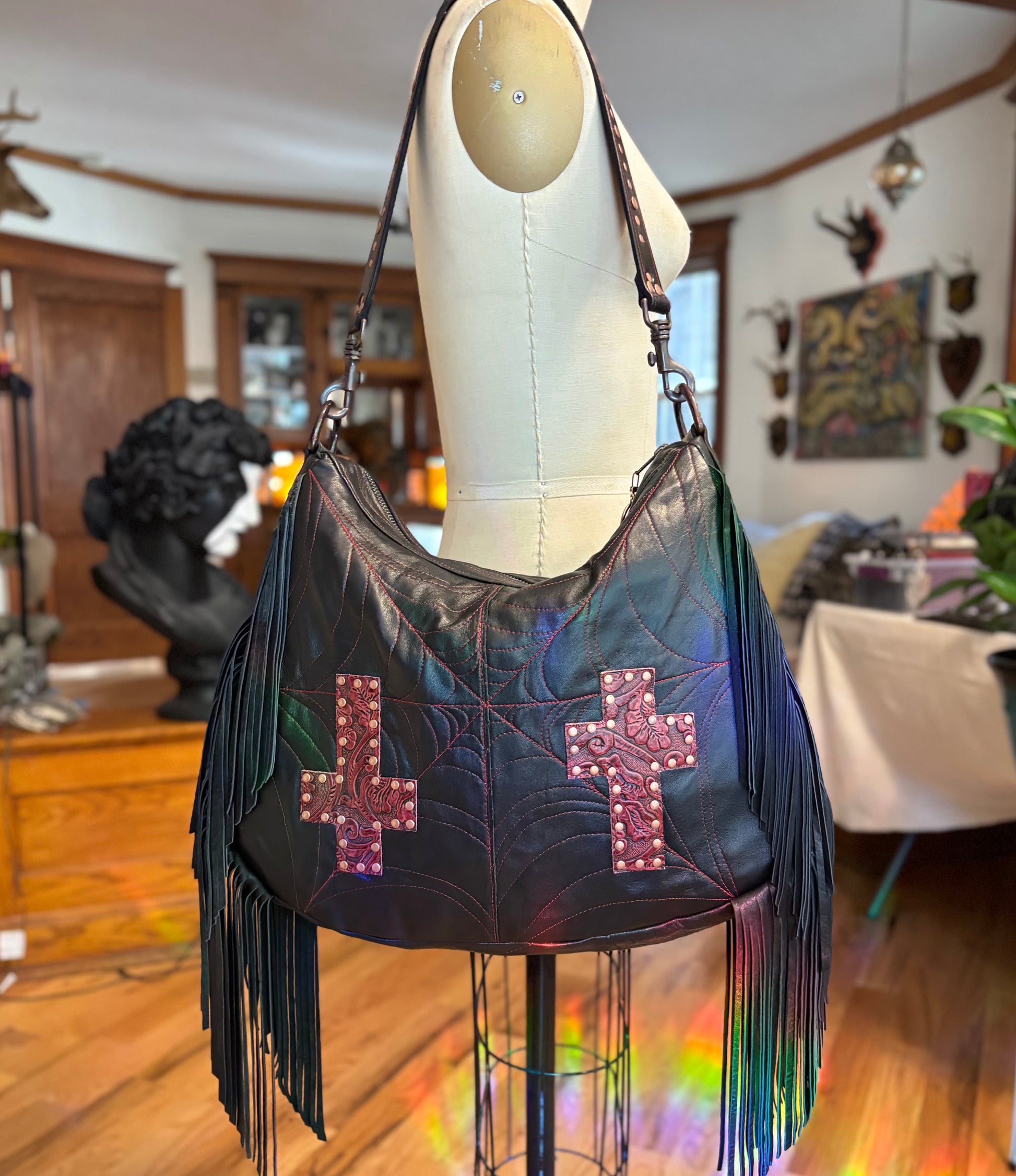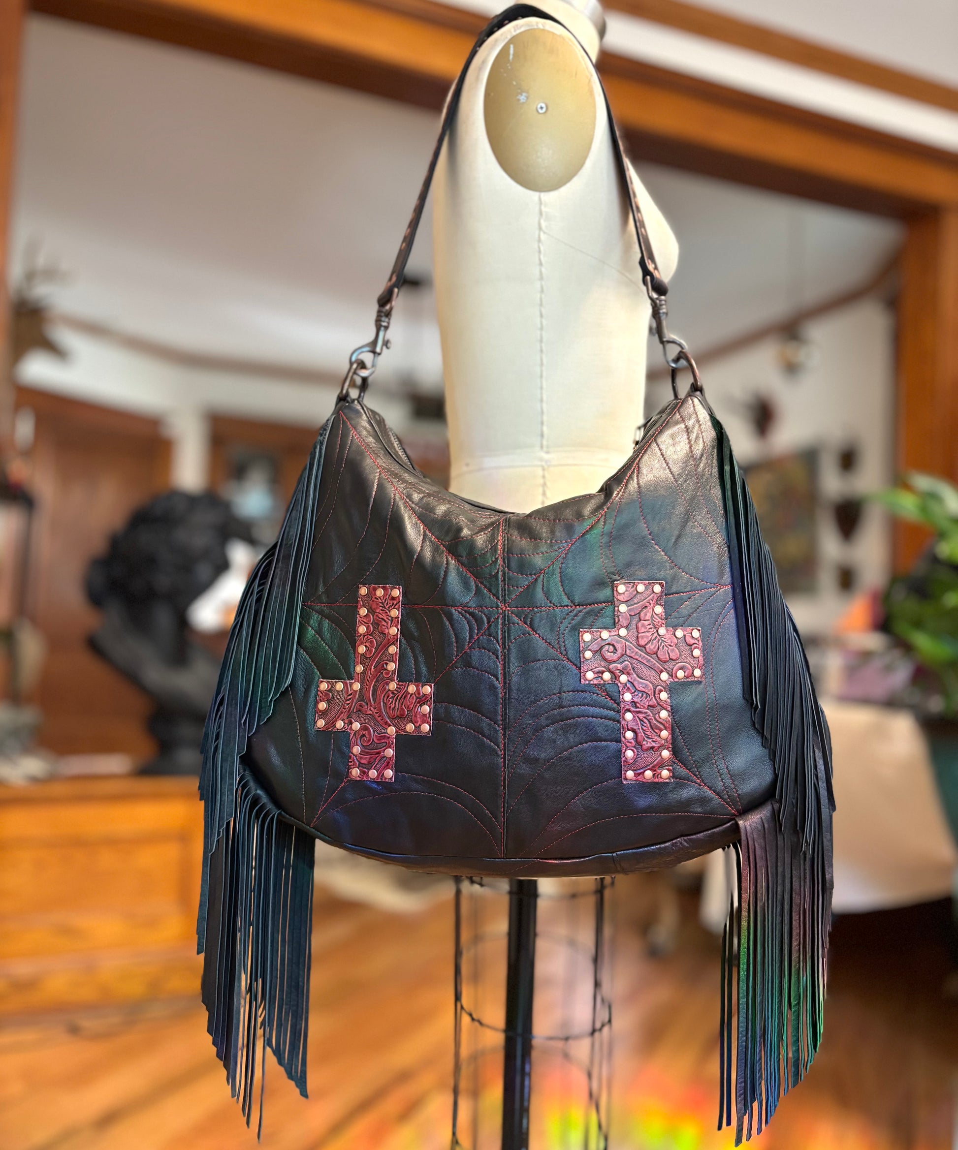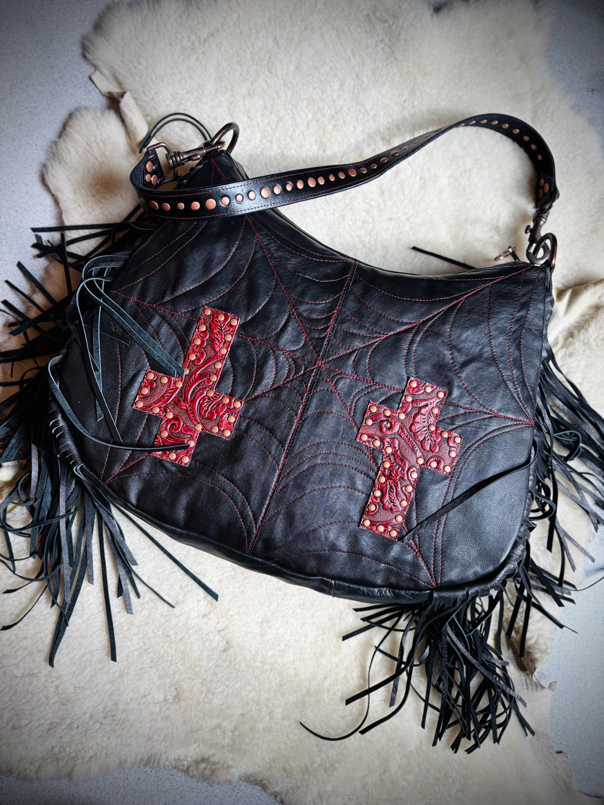 Black reclaimed leather, accented with deep red stitched cobwebs. Two oxblood crosses sit at the ends, framed with copper studs. Lots of thin, soft fringe lines all four edges. Fun, gothic phone pocket sits on the back. Fully lined in mauve rose faux suede with 2 interior pockets. Suede lined strap has red stitching and copper studs. Lightweight, roomy and so beautifully unique.