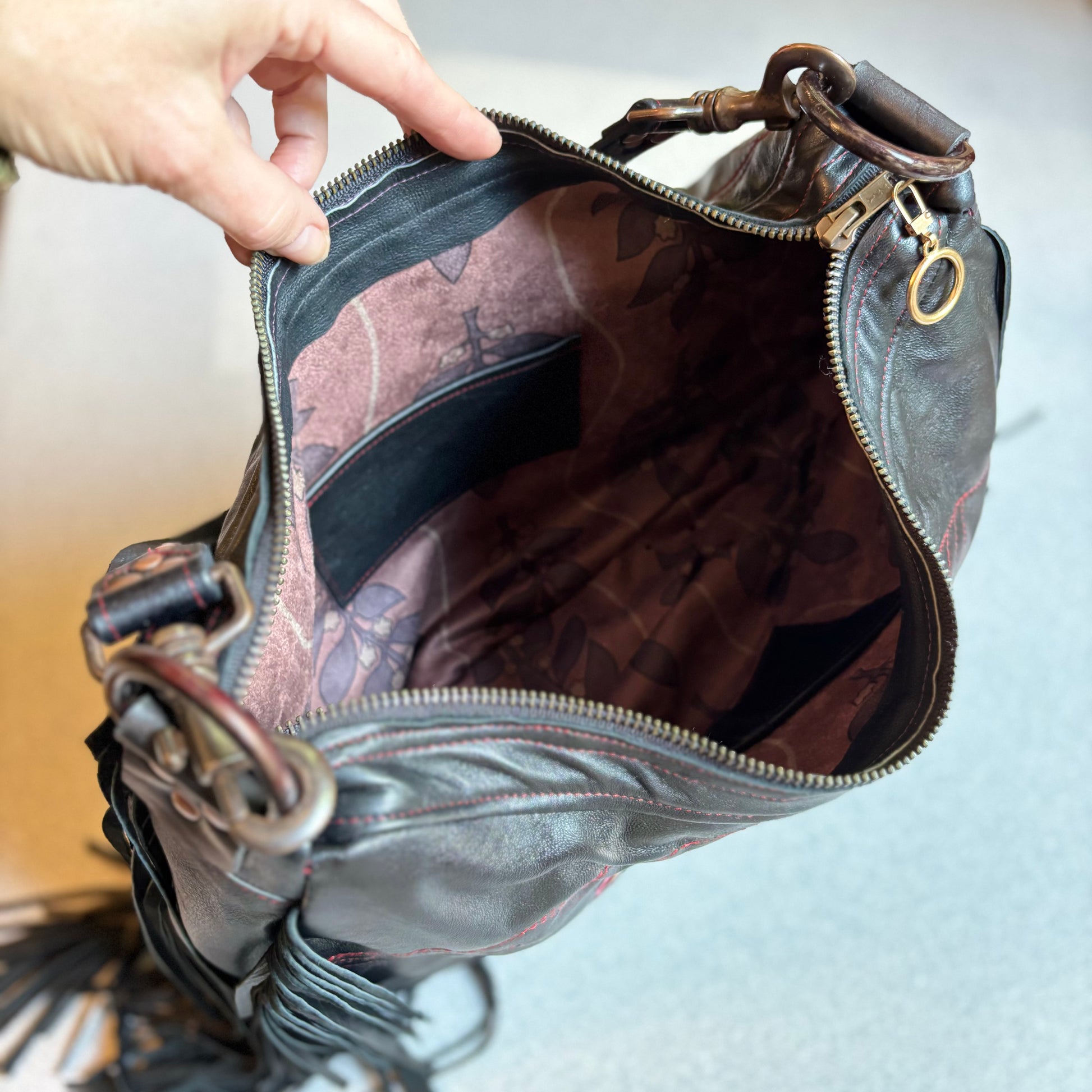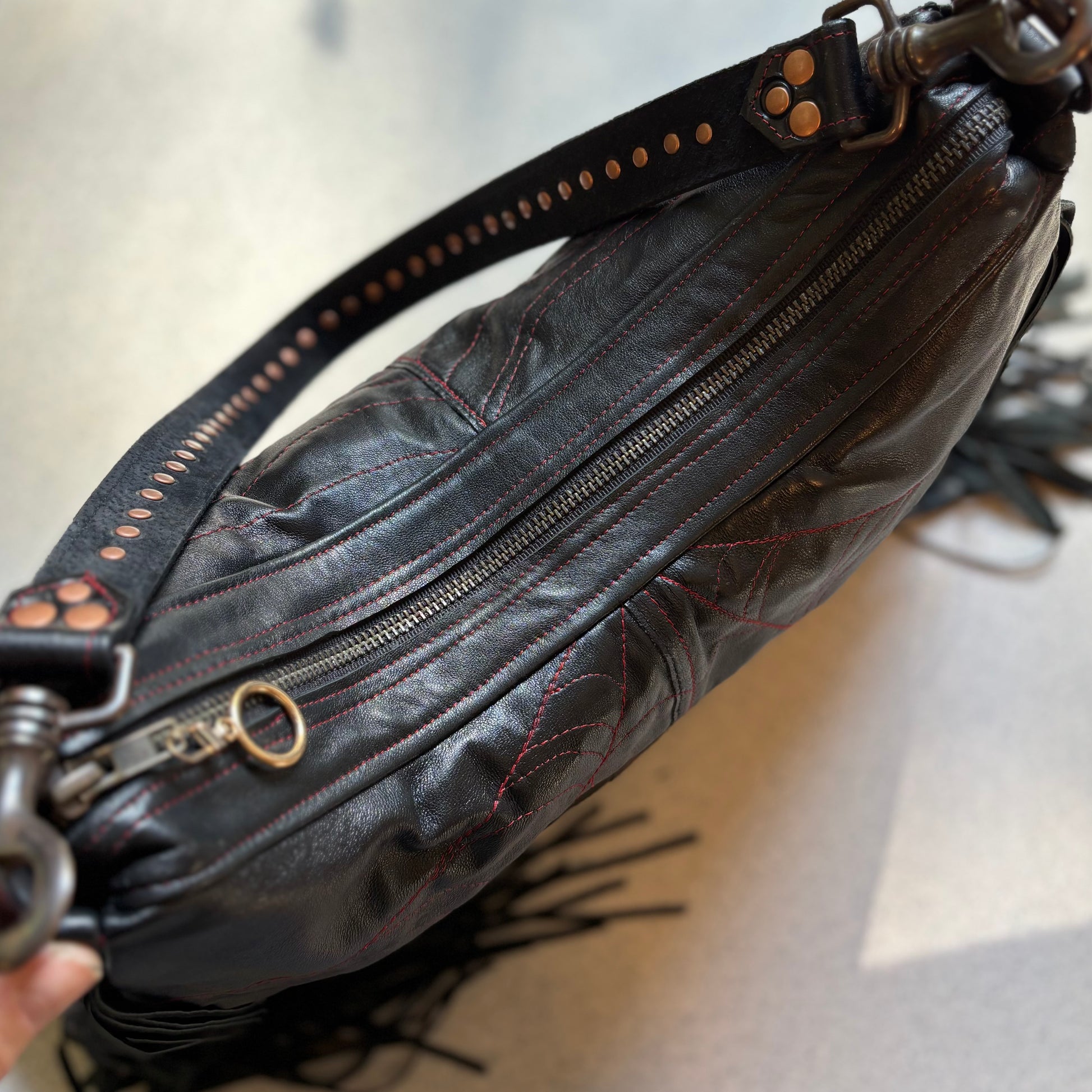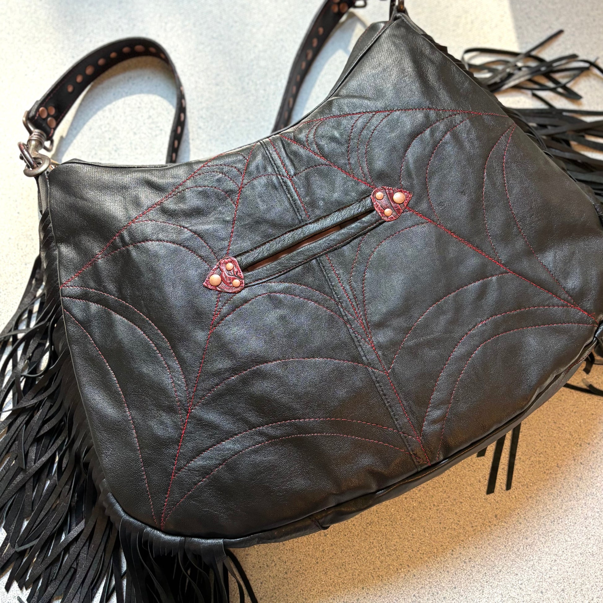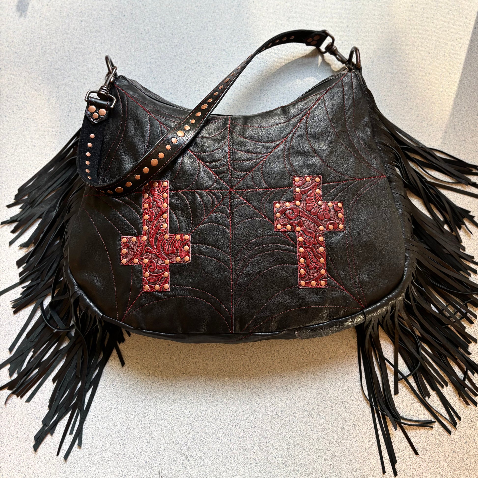 Black reclaimed leather, accented with deep red stitched cobwebs. Two oxblood crosses sit at the ends, framed with copper studs. Lots of thin, soft fringe lines all four edges. Fun, gothic phone pocket sits on the back. Fully lined in mauve rose faux suede with 2 interior pockets. Suede lined strap has red stitching and copper studs. Lightweight, roomy and so beautifully unique.