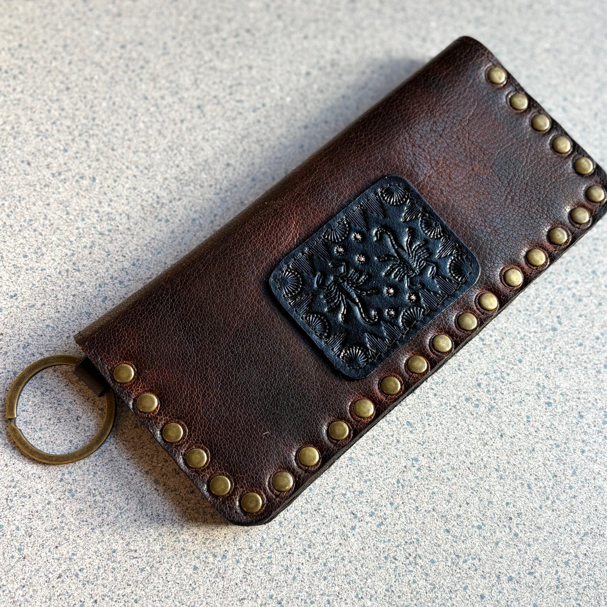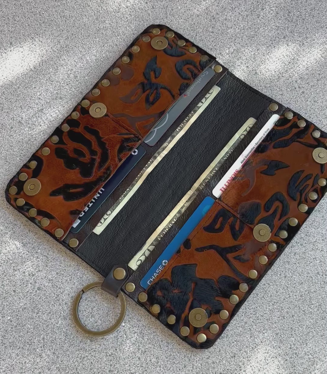 Made with a glazed buffalo leather exterior and super fun interior made from really cool sculped calfhair and reclaimed leather pieces. Cute double Scorpio stamp on the front. Antiqued brass hardware. Cash & cards not included.