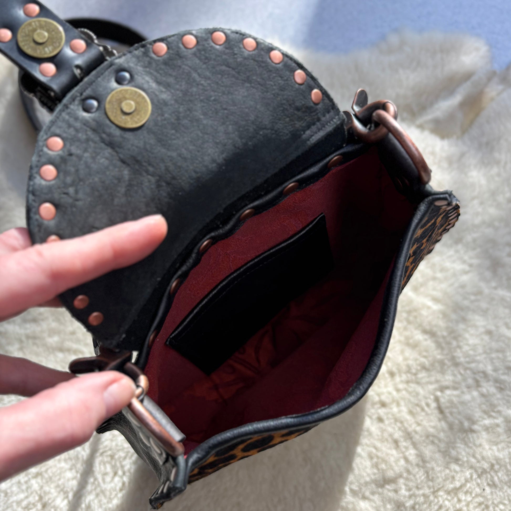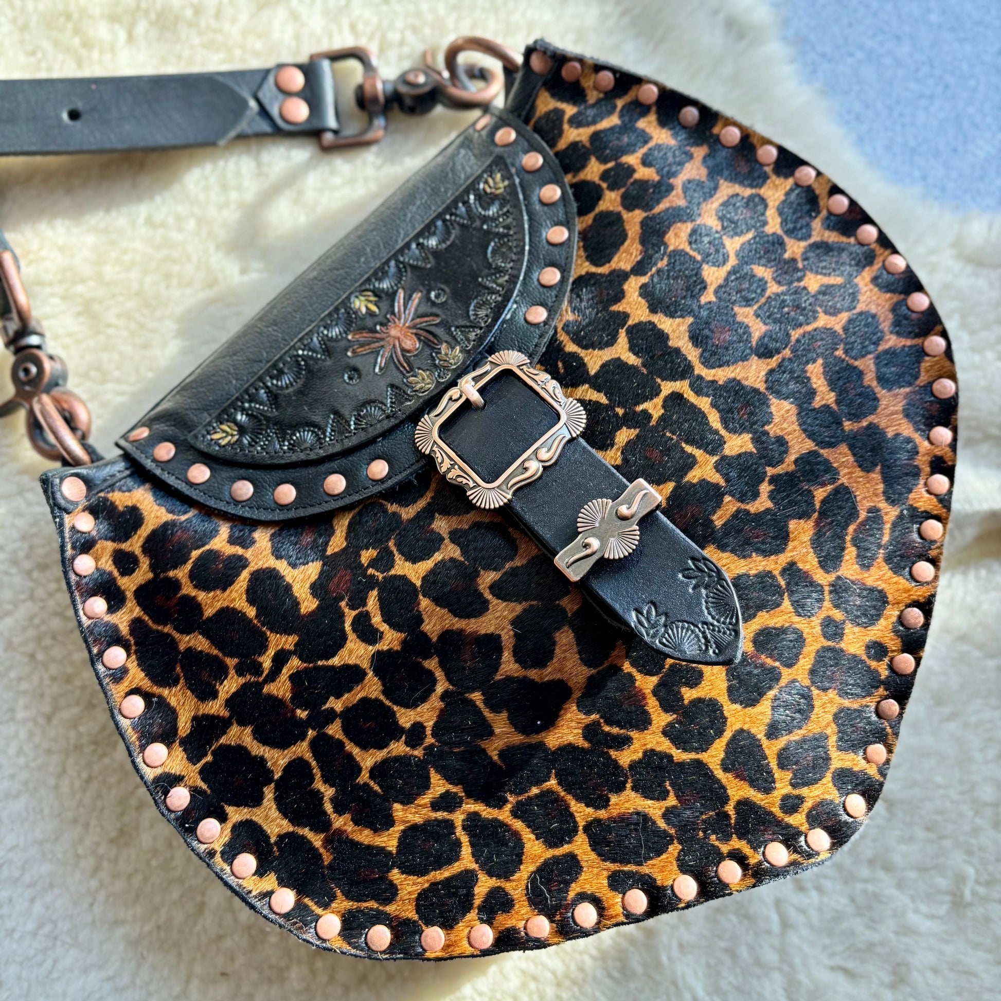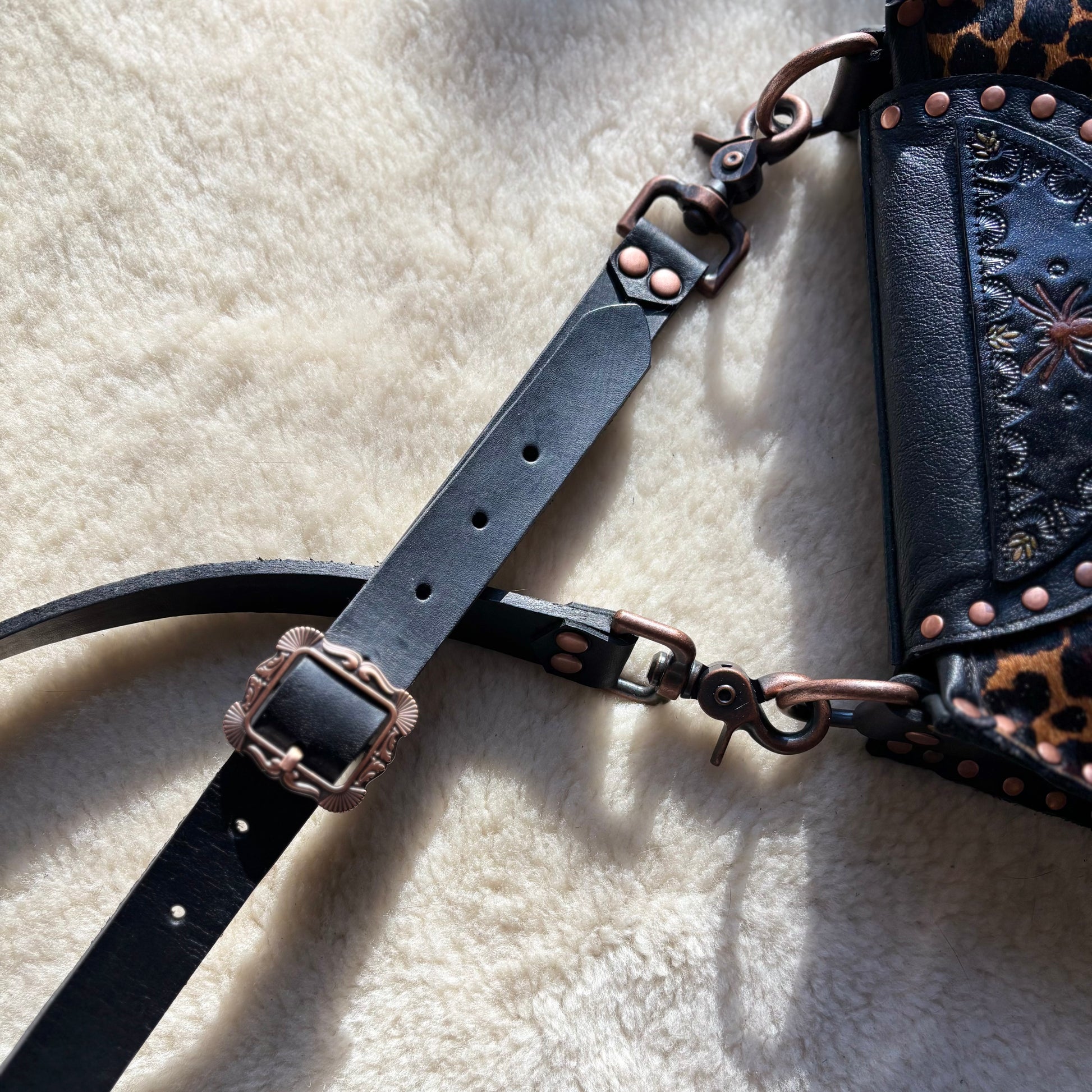 This is the fancy one of the bunch, with a few little details that make it special. Hand stamped & painted top flap looks so great with the leopard print. The colors combine just beautifully. I used copper hardware, which I don’t do often, but love the results! The design on the buckle is so fabulous and they really add to the eclectic vibe this bag has. Make sure to check out the video so you can see that these are FAUX buckles. I mean, they’re real buckles, but they’ve been attached in a way so that you don’t need to buckle them, just simply snap them closed. Easy as pie :) This collection is all fully lined in the most luscious deep red brocade and each bag has one interior pocket. The strap is fashioned with a coordinating buckle and adjustable from 44”-50”.
