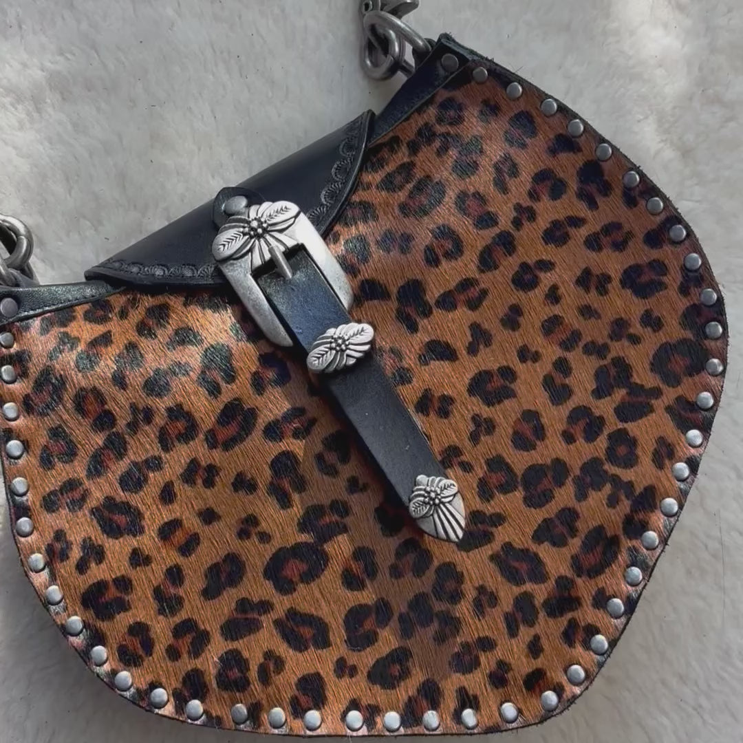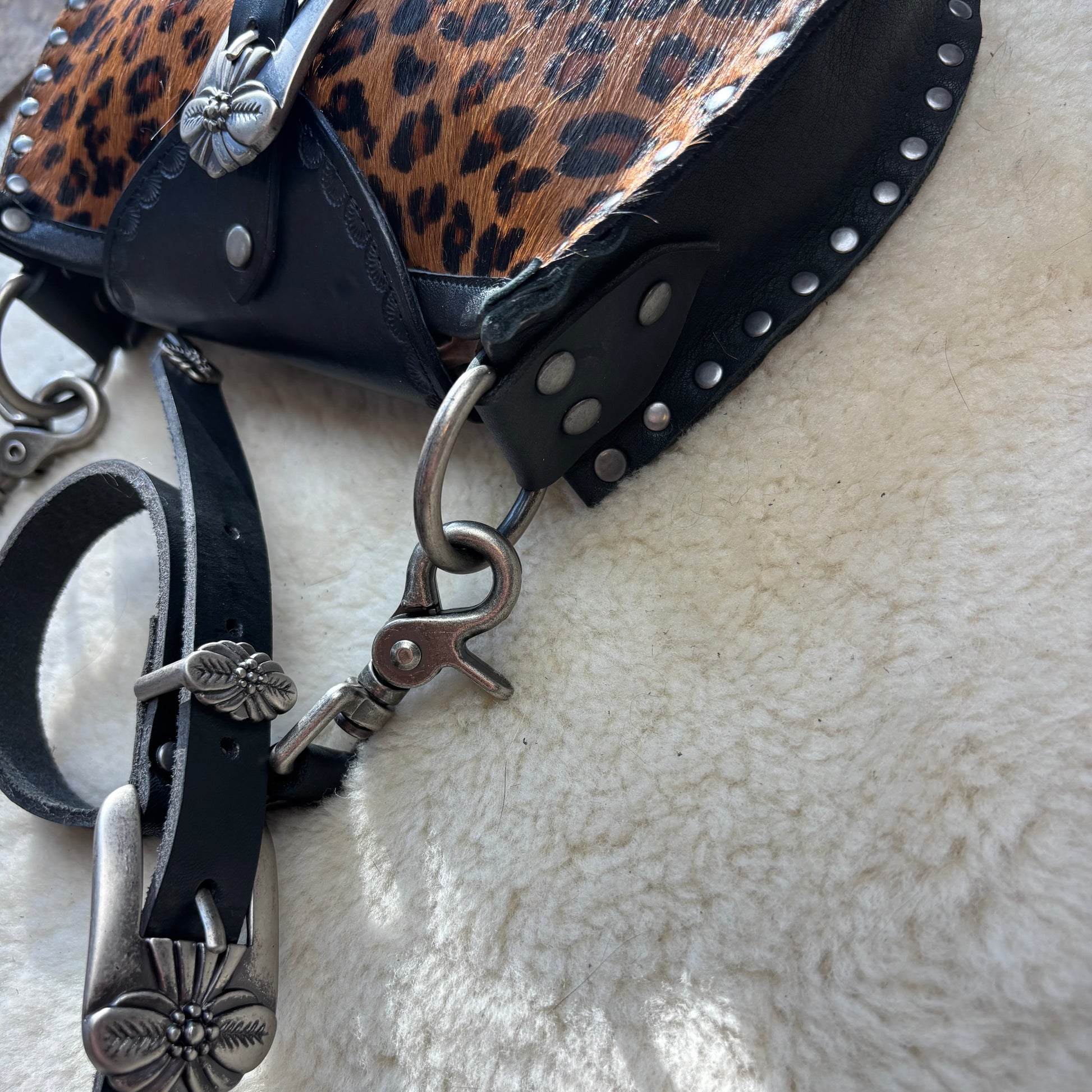 These are the most perfect colors together- shades of brown & black cheetah printed hair-on cowhide. It’s soft & smooth and requires no special care. Antiqued silver hardware, including these beautiful heavy floral buckles. Make sure to check out the video so you can see that these are FAUX buckles. I mean, they’re real buckles, but they’ve been attached in a way so that you don’t need to buckle them, just simply snap them closed. Easy as pie :) The backside of the bag is black leather.