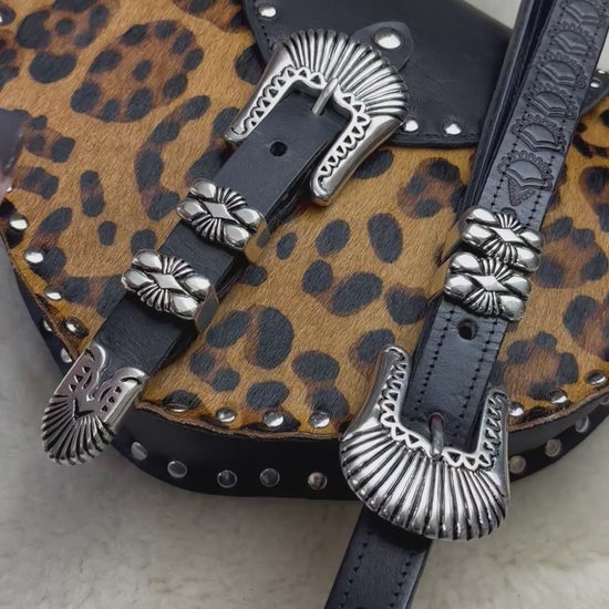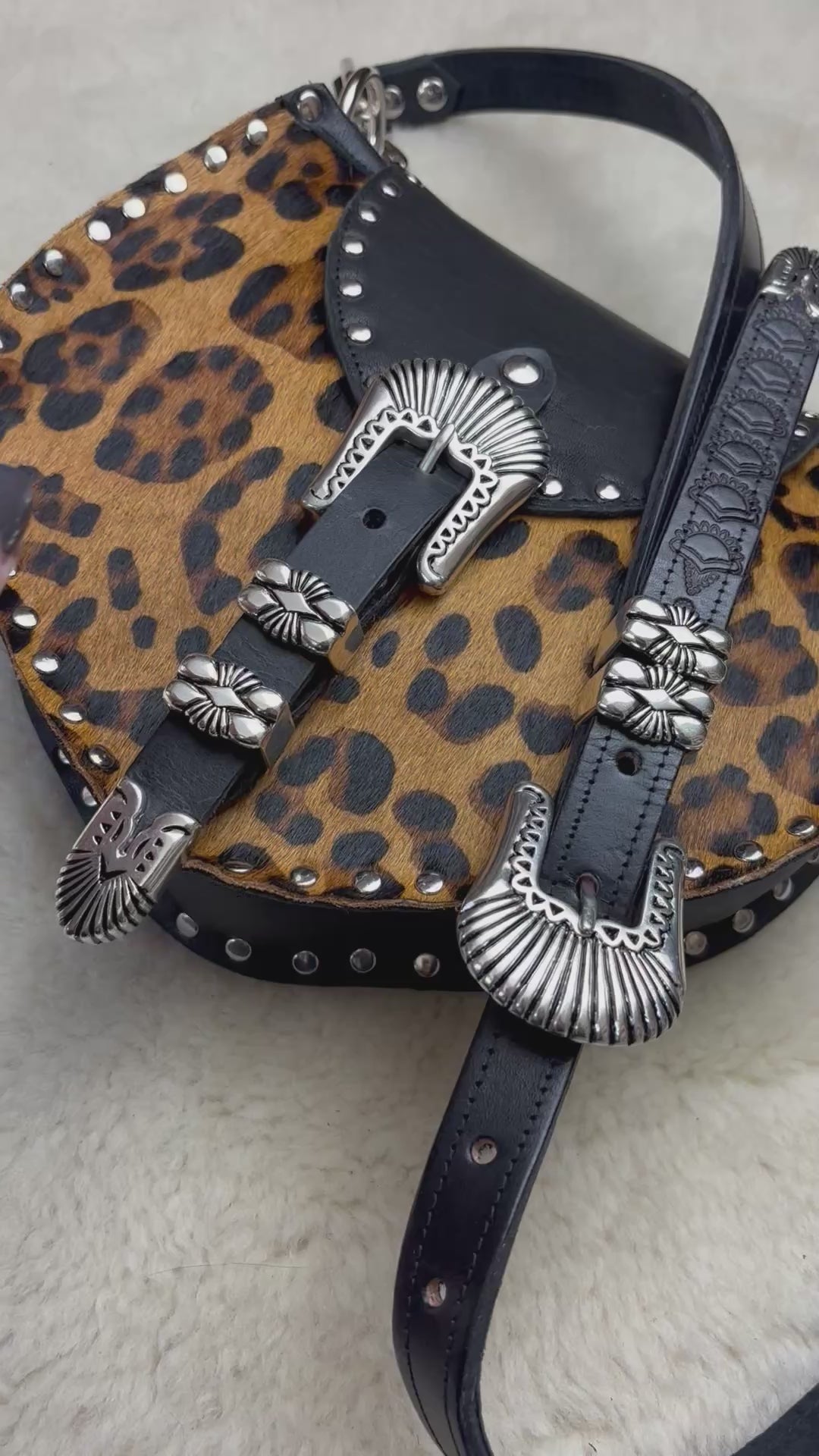 Made out of leopard printed hair-on cowhide, with black back and sides. I chose the most intricate buckle set I had in bright silver, I’ve been waiting to use these beauties! I know buckles look great but can be cumbersome on a bag, so I made these closures with magnetic snaps! They open & close super easy and they stay closed tightly for your security. The bag is fully constructed with rivets, is lined in black jacquard with one inside pocket, and has an adjustable strap with a matching buckle. The strap can unclip so you can have the buckle on your front or back.