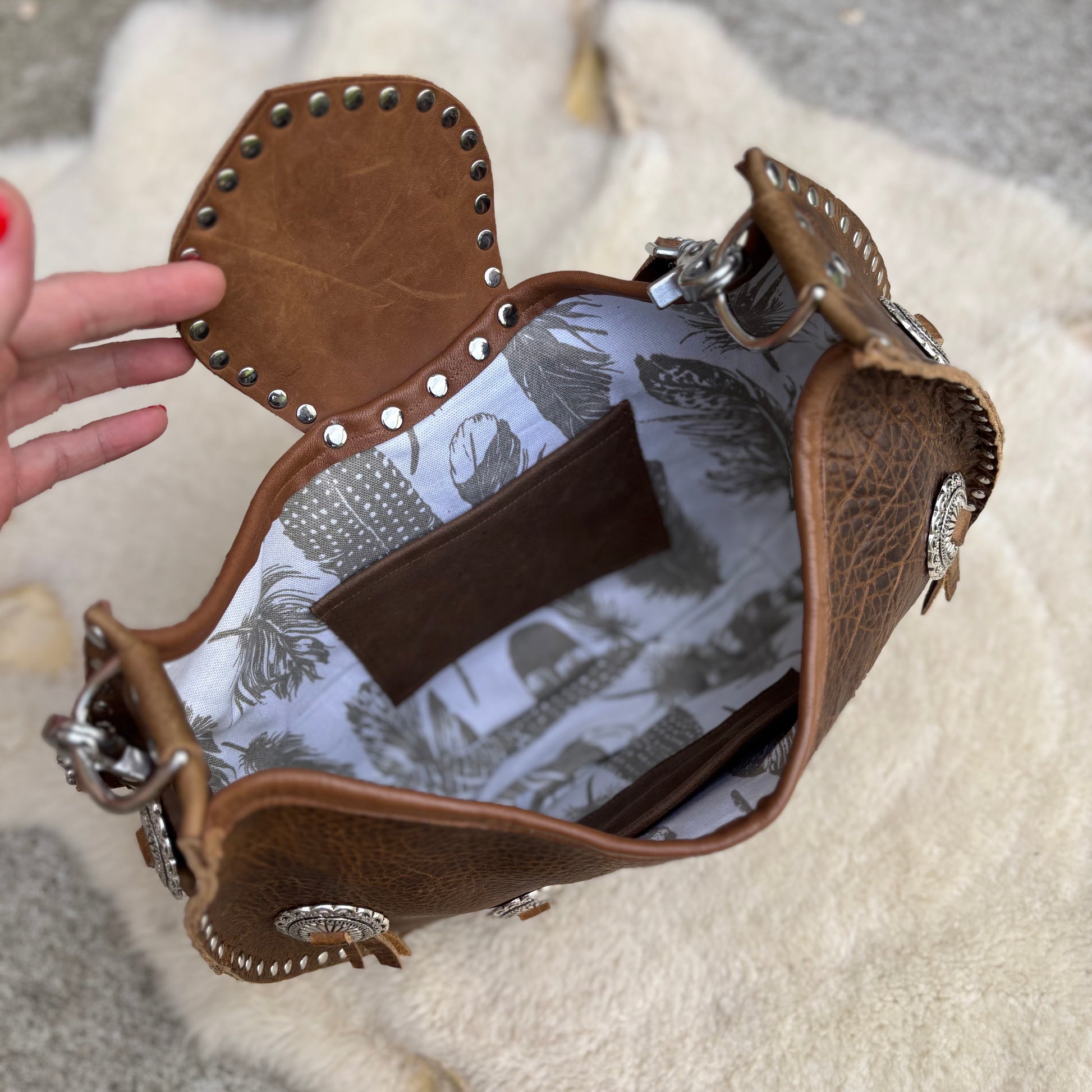 Made out of thick rustic & distressed brown cowhide. This leather will continue to soften, change color in some areas and “break in.” These are my favorite kinds of leathers- the more distressed, the better. There are a total of 7 bright silver conchos on the front and the sides. Full studded construction and lots of shiny silver hardware. Lined in feather printed cotton canvas with 2 interior pockets and a large phone pocket on the back. Snaps easily and securely with a hidden magnet. Â