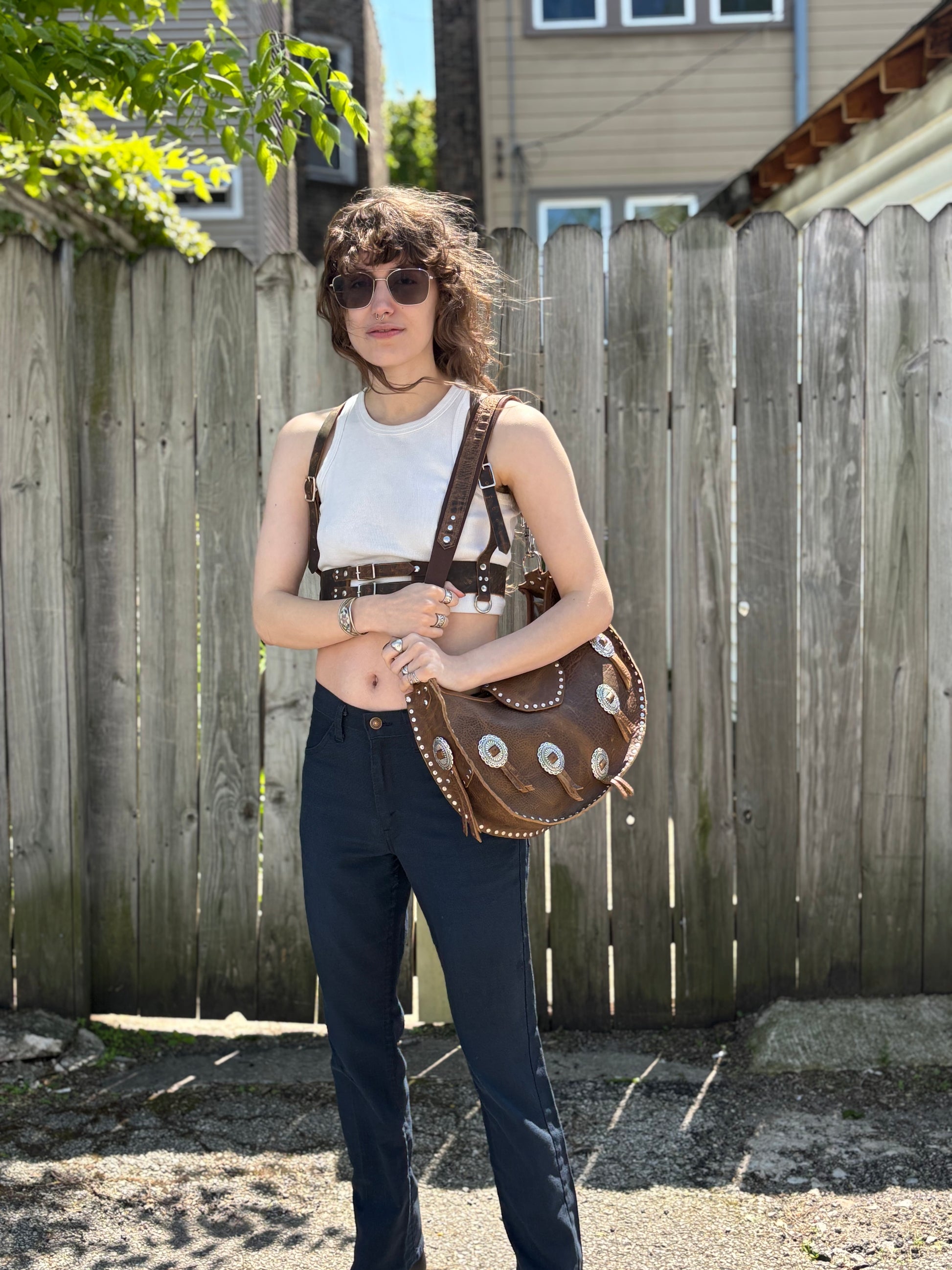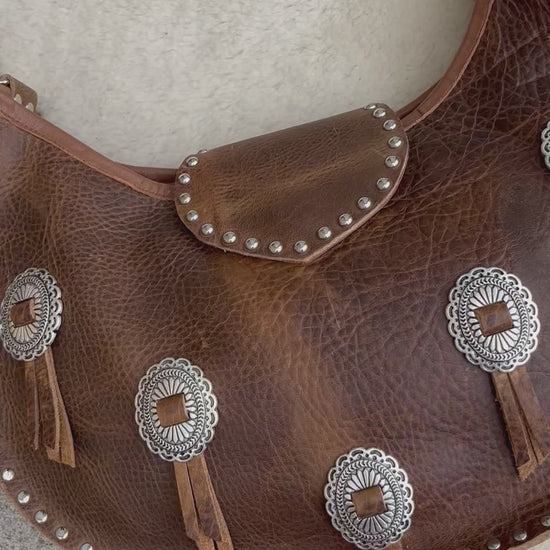 This yummy rustic brown leather combined with the shiny silver conchos just speaks to my heart đź–¤ A perfect sized bag for every day use- not too small but not too big.  Sits safely & comfortably on your shoulder and close to your side.  You’ll love walking with this gal.  Â