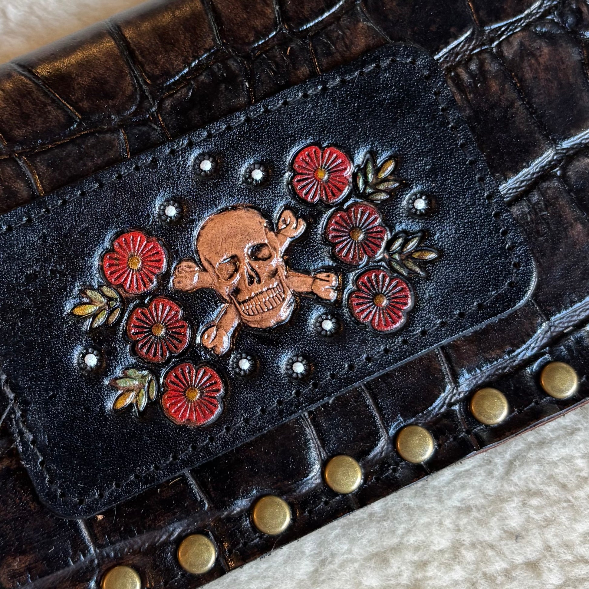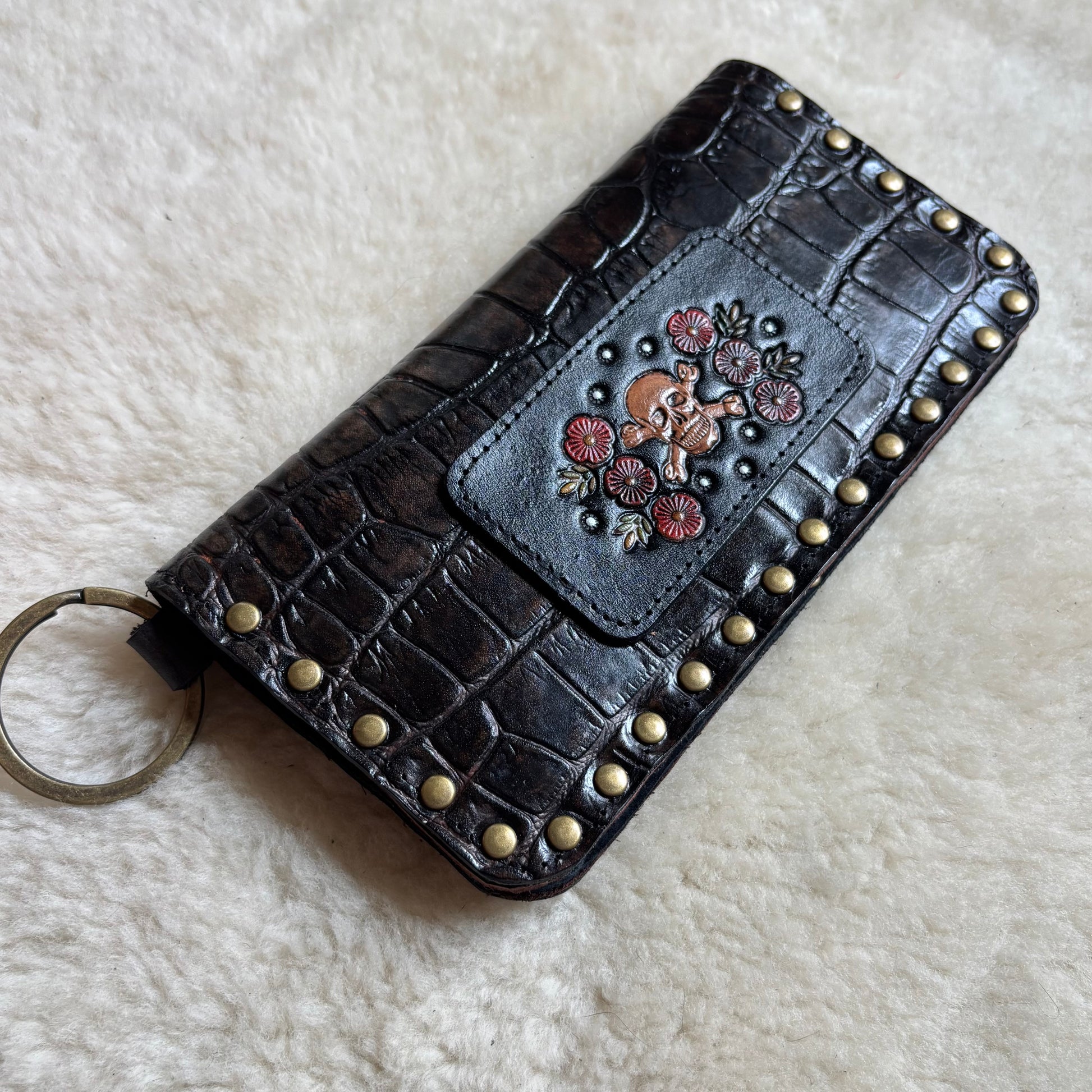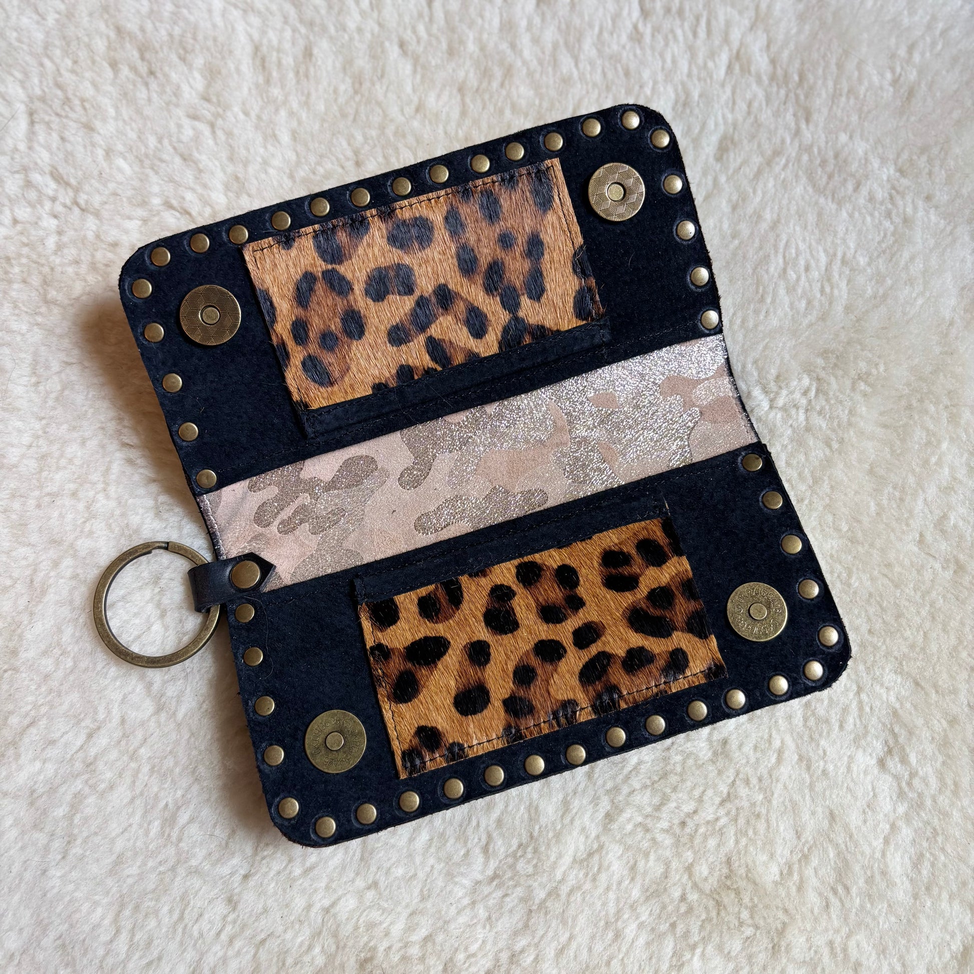 Hand dyed and stamped, constructed with antiqued brass hardware with a side key ring. Beautiful interior made with metallic camo, black suede and leopard printed calfhair. Looks fantastic with the brass wallet chain (chain not included, see separate listing).