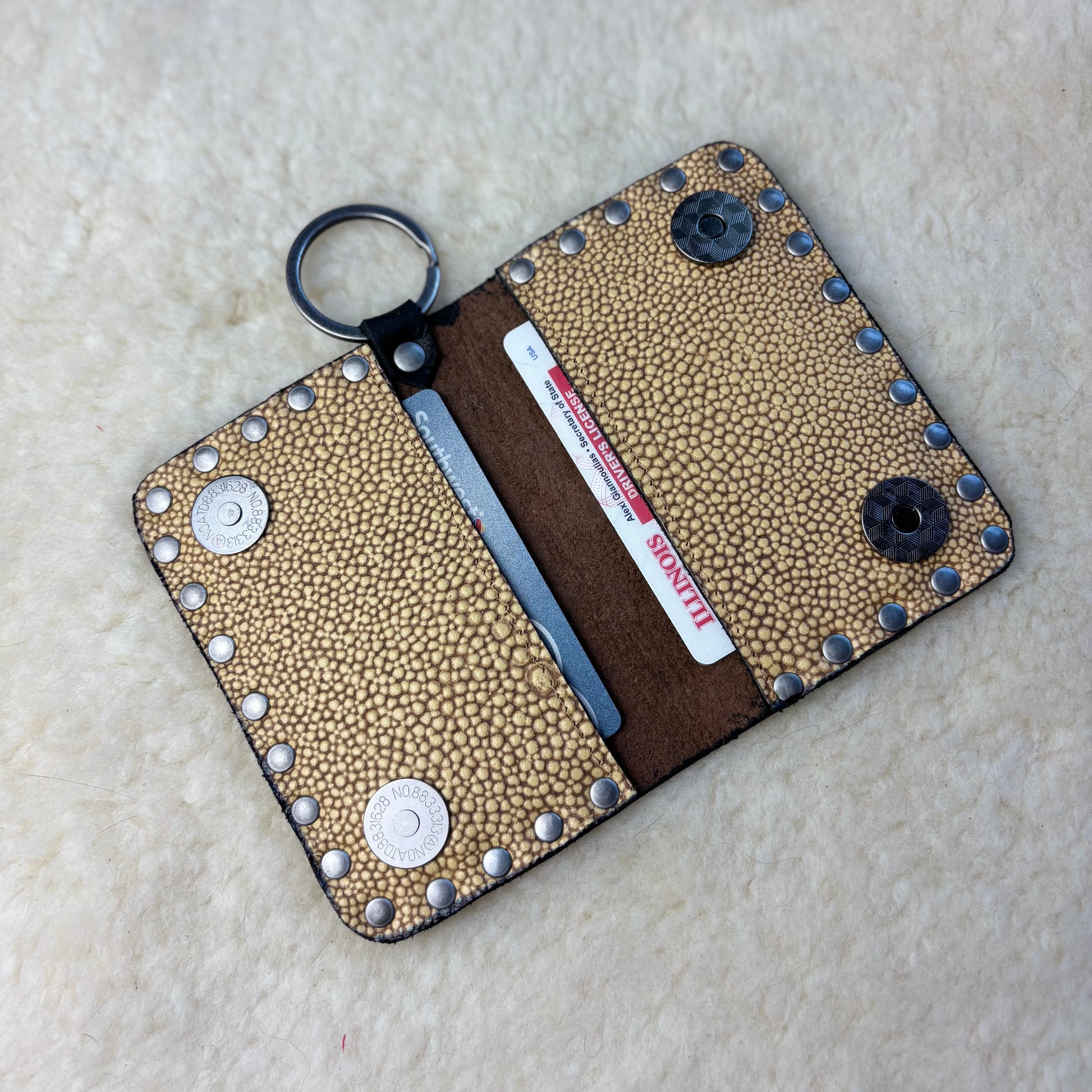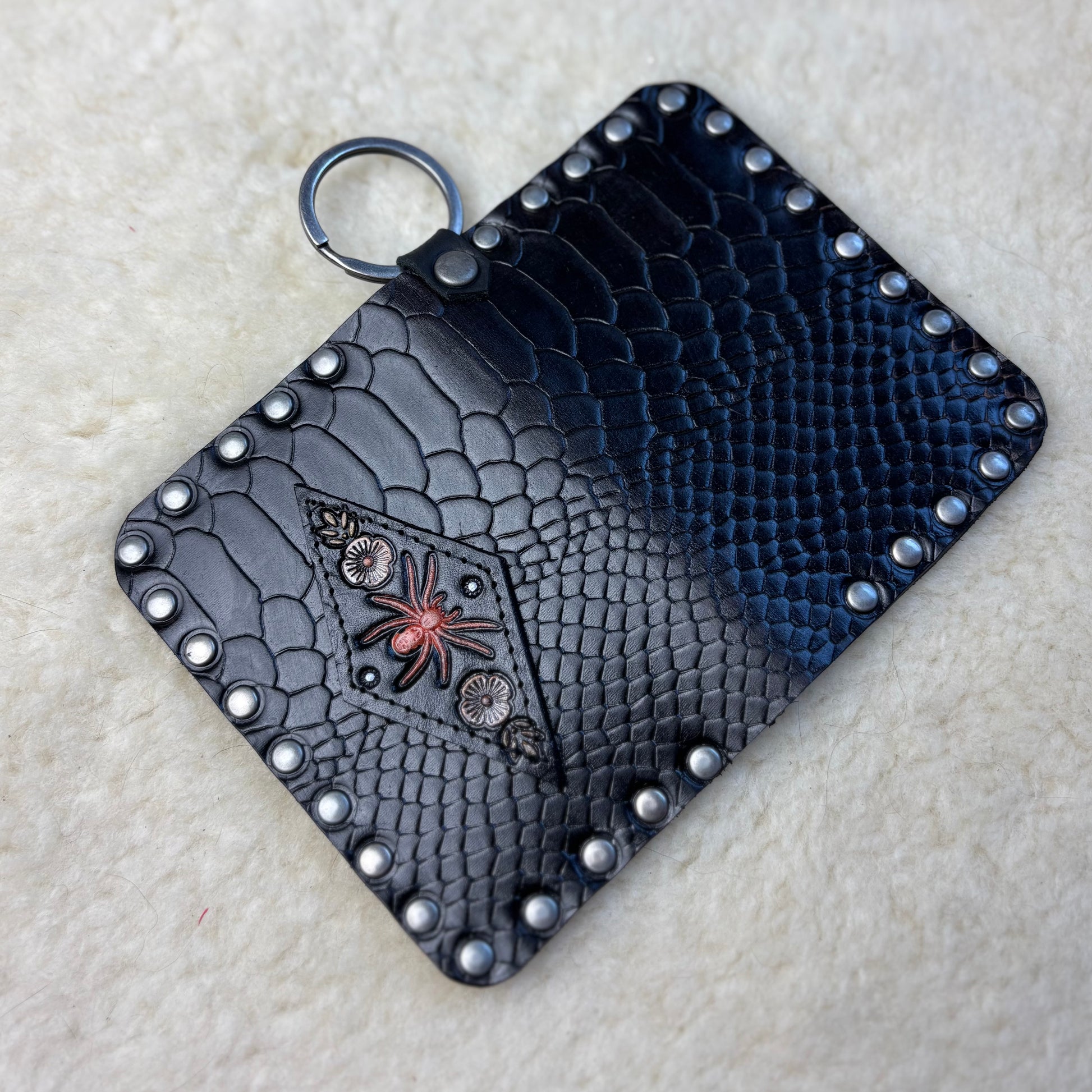 These little cuties are just perfect for the minimal maximalist 🖤 A simple two-pocket magnetic snap wallet made out of snake embossed leather with a hand stamped patch stitched to the front. Beautiful lined leather pockets are done in contrast colors. Snaps close quickly, easily and securely.