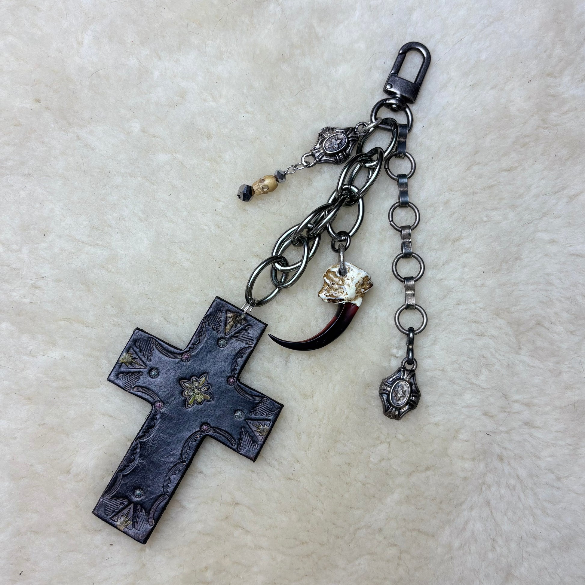 Dress up your simple bag or make your wild bag even wilder! This 9” bag charm is made with gunmetal and vintage chain adorned with a large leather cross, a faux tiger claw, carved bone skull and vintage charms.